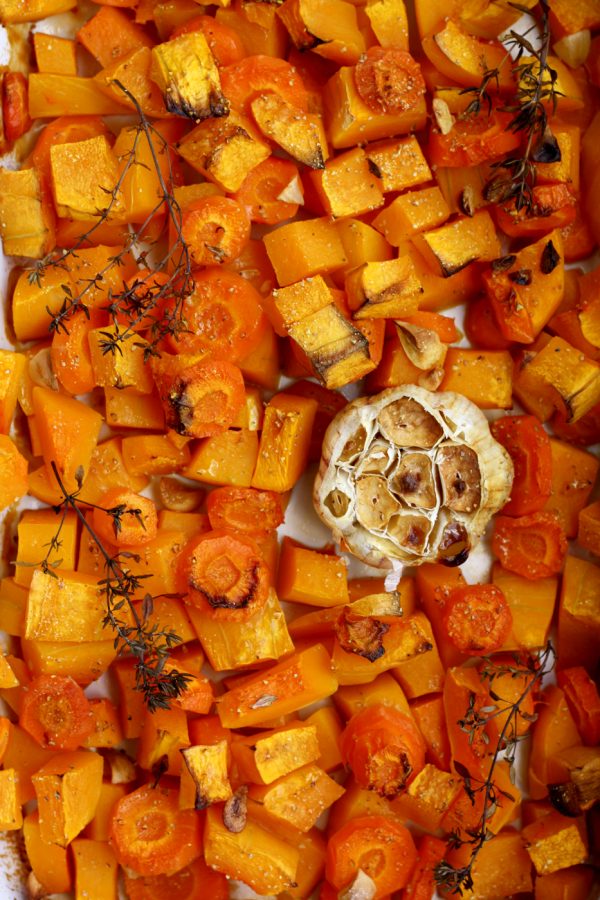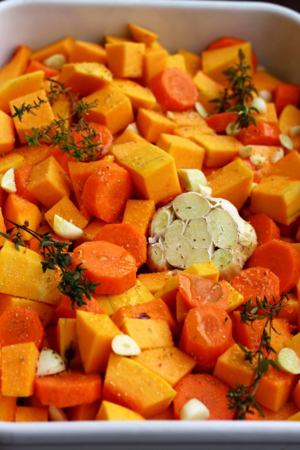 - Preheat the oven to 200 °C or 390 °F. Peel, pit and roughly chop butternut squash and chop carrots in similar sized chunks (see the picture below). Cut the tip off the garlic head, exposing the ends of the cloves, so that it's easier for you to peel them later. Transfer the chopped vegetables and the garlic head to a backing dish. Drizzle with olive oil, add thyme sprigs and sprinkle with salt and pepper. Roast for 40 minutes or until golden brown.